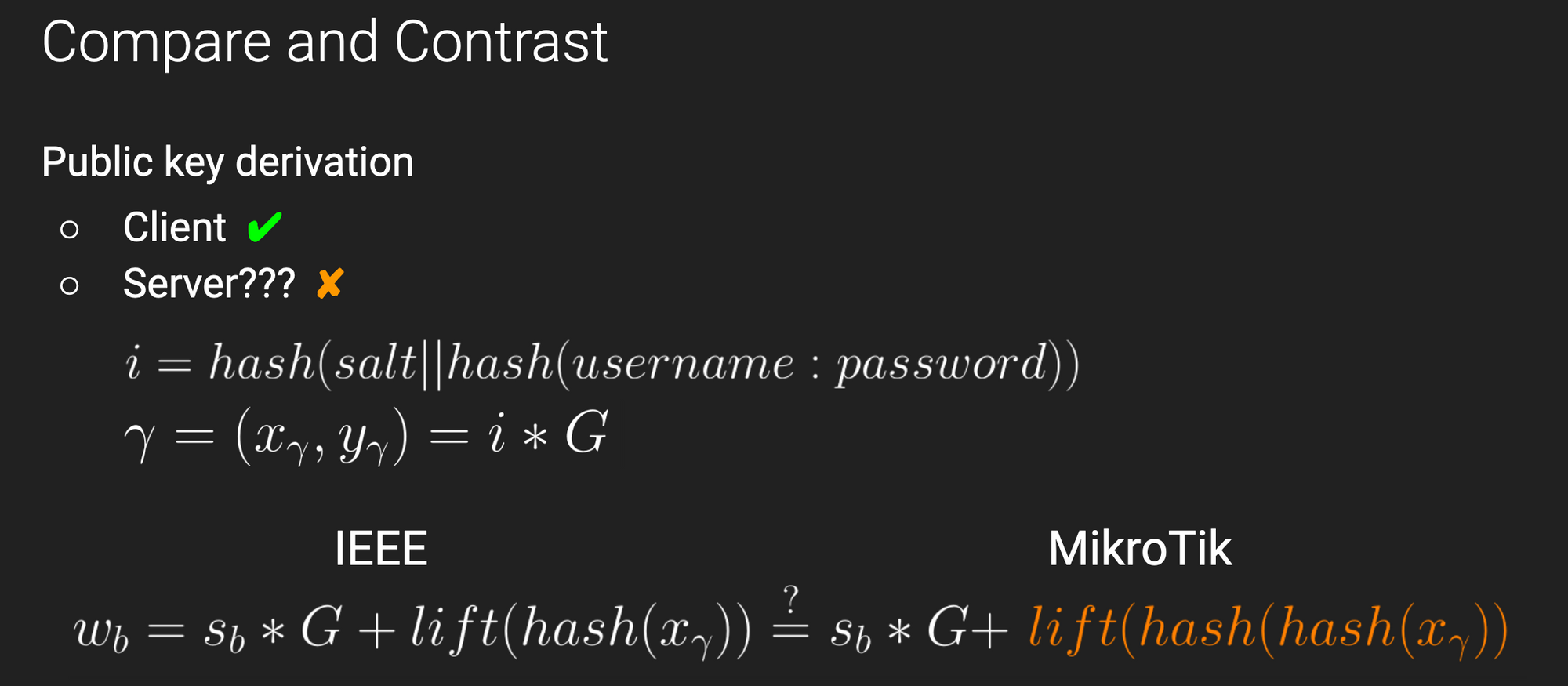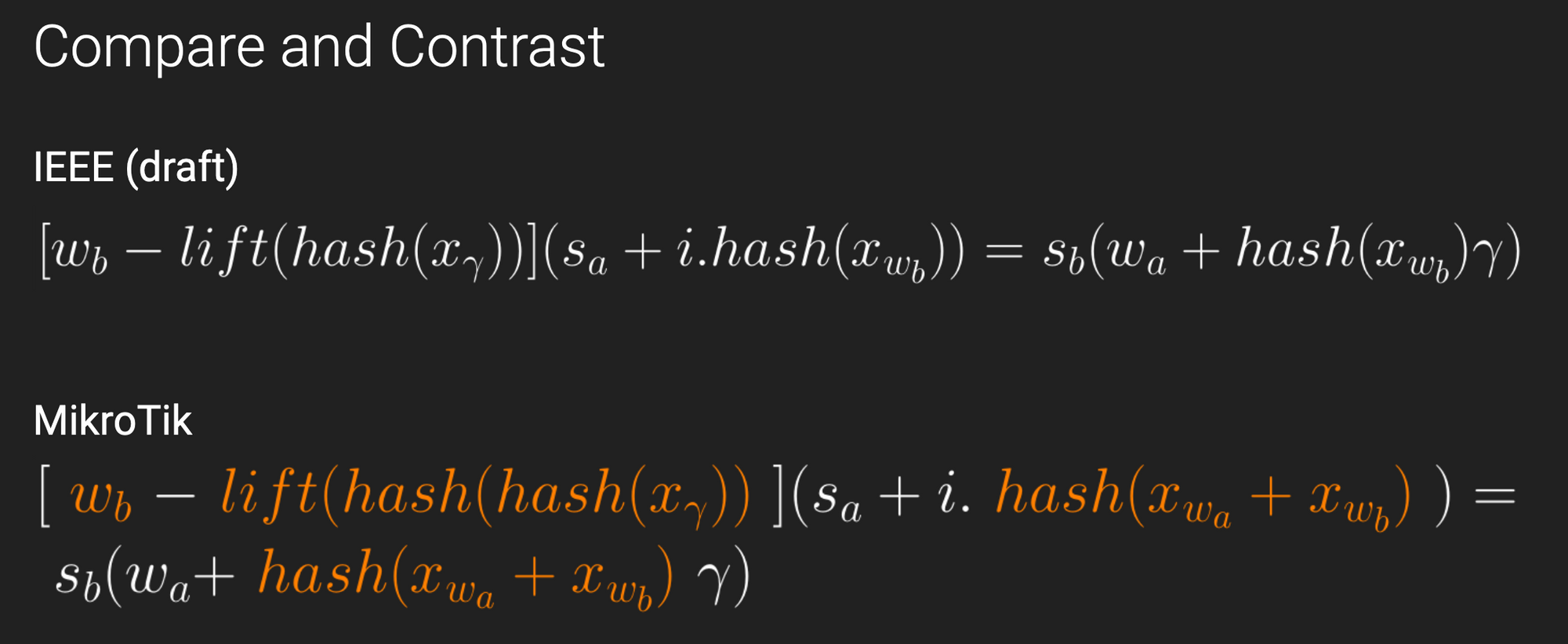 It is therefore unsurprising when we find that there are a number of differences in the MikroTik calculation, as shown below in orange, versus the IEEE submission draft. It is rather remarkable that, even with these alterations, the MikroTik server and client still successfully generate a mutual shared secret. Feel free to marvel at that realization, we surely did!