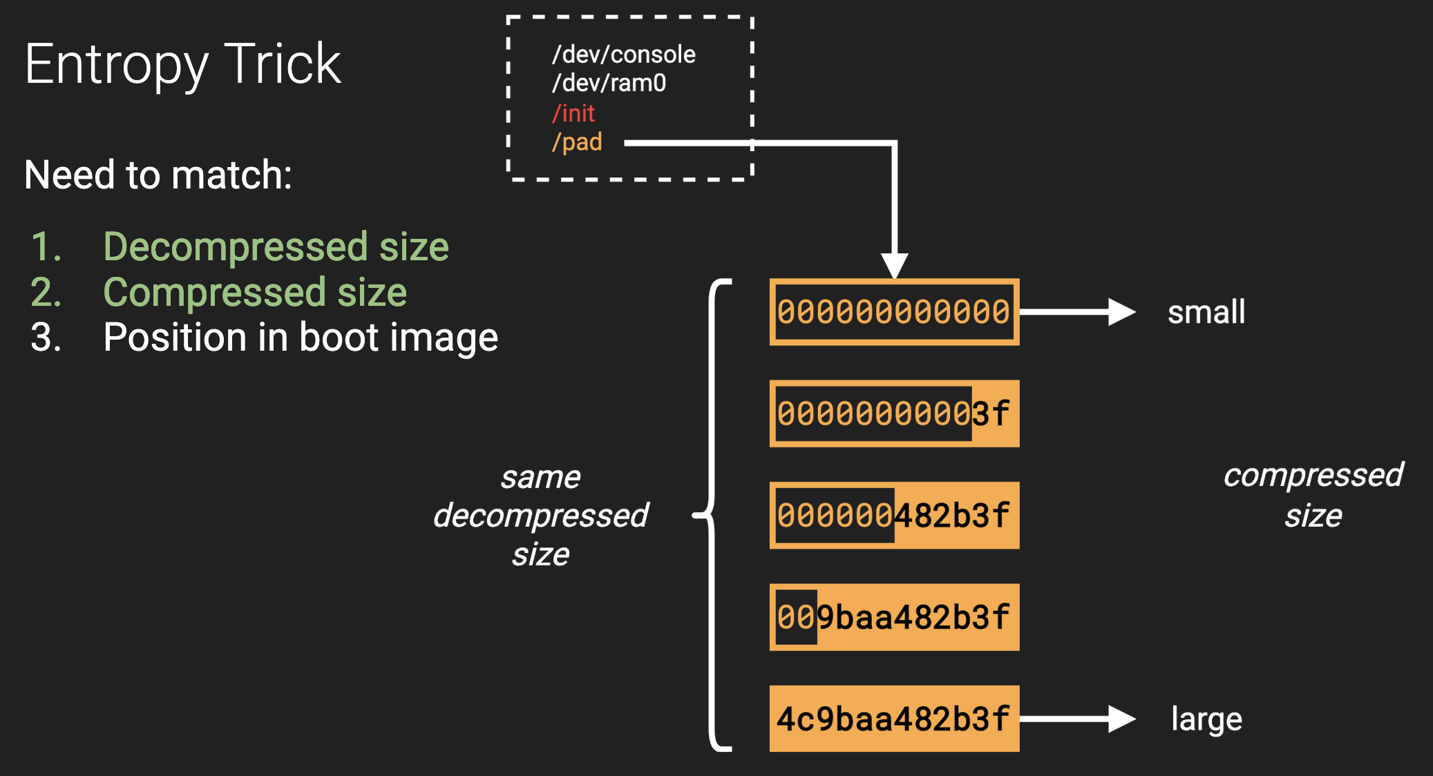 To solve the first two constraints, we make use of an “entropy trick.” Specifically, we create a dummy file, pad, inside our initrd directory and adjust its size to match the decompressed size of the original initrd directory. Then, by adjusting the amount of entropy in the file, we control the compressed size of initrd.rgz: