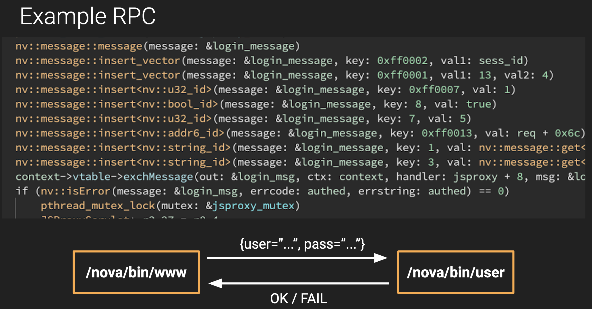 Armed with this information, we can now start to make sense of some RouterOS code. In the following image, we see www sending an authentication request to user. It constructs a new nova message, setting SYS_TO to the address [13, 4] and setting SYS_CMD to 1.