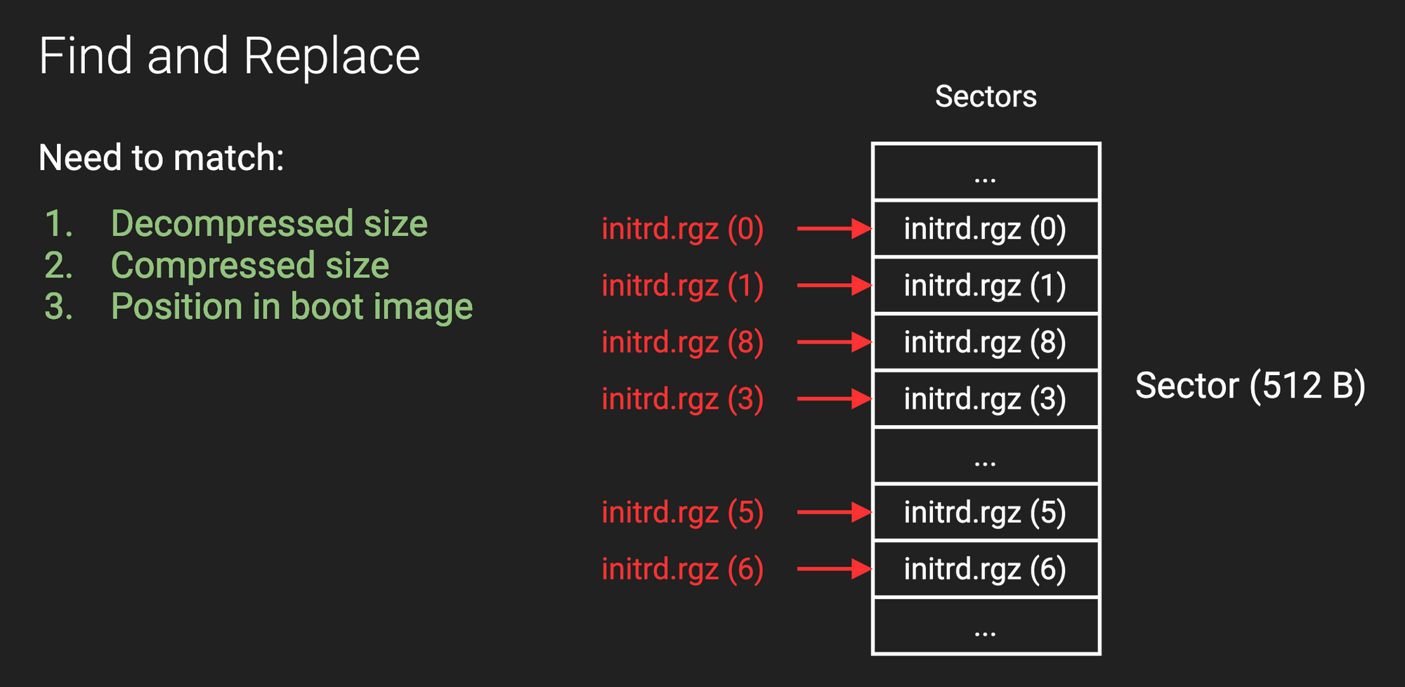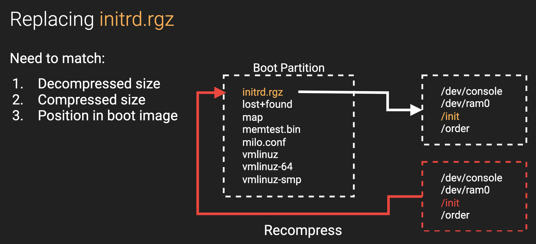Unfortunately, if we now mount the filesystem in the boot image and copy over our modified initrd.rgz file, the kernel still won’t boot. This is because the kernel expects that initrd.rgz resides at a very specific location in the boot image. When we mount the filesystem and copy the file, it adjusts the position of the actual data. This problem is relatively easy to fix; we can simply do a find-and-replace for every 512 byte sector of the original initrd.rgz and swap it with our modified initrd.rgz. This strategy effectively operates on the raw bytes in the disk image instead of mounting the boot sector as a filesystem.