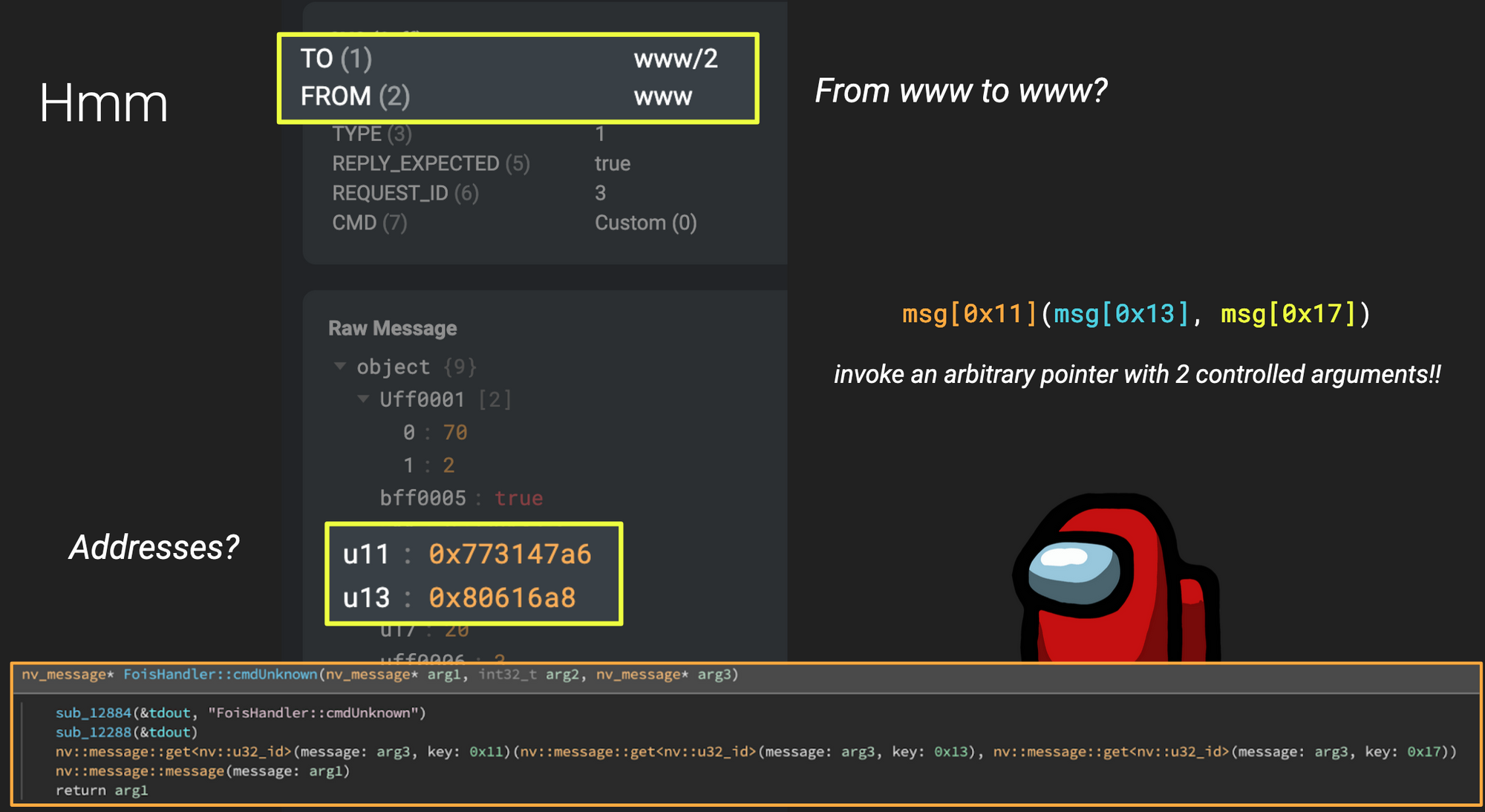 Very spicy! If we could hit this handler with an arbitrary message, we could invoke any pointer and surely get a shell! But can we hit it?
