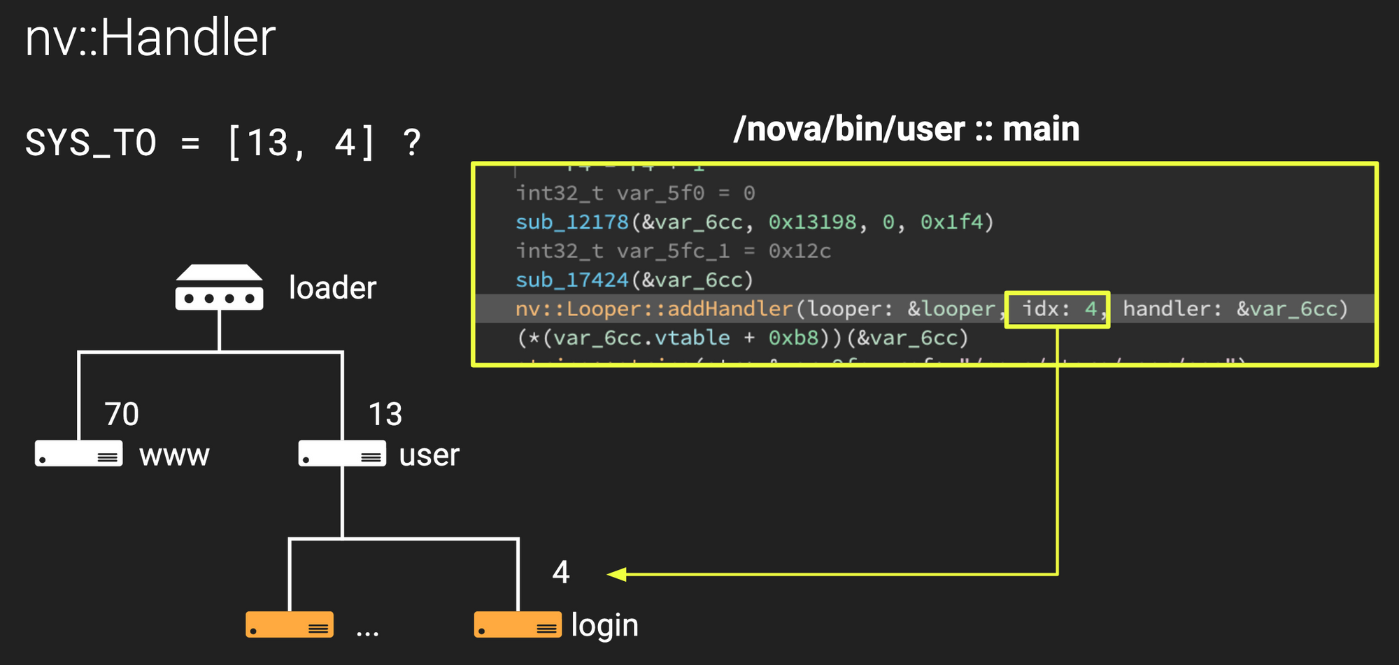 It turns out that RouterOS processes can register “Nova Handlers” (nv::Handler) which act as subsidiary components, capable of handling and responding to their own requests. In this case, we see that user registers several handlers in main, one of which is registered at index 4: