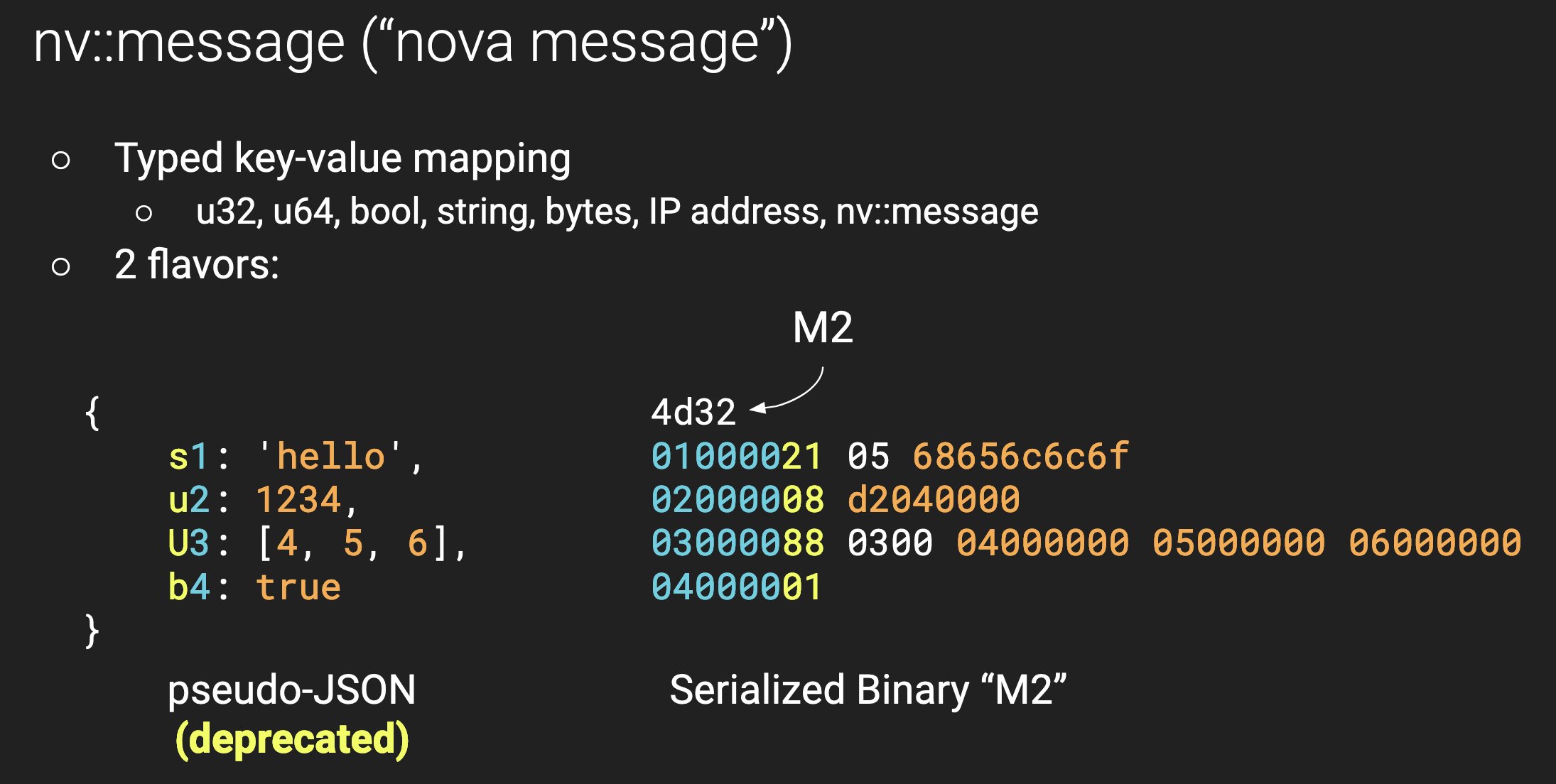We’ll start with the core player: “Nova Message” (nv::message internally). A nova message is a typed, key-value mapping. It comes in two flavors: a pseudo-JSON variant (now deprecated), and a serialized binary variant. You can recognize the binary messages because they always start with M2 in ascii: