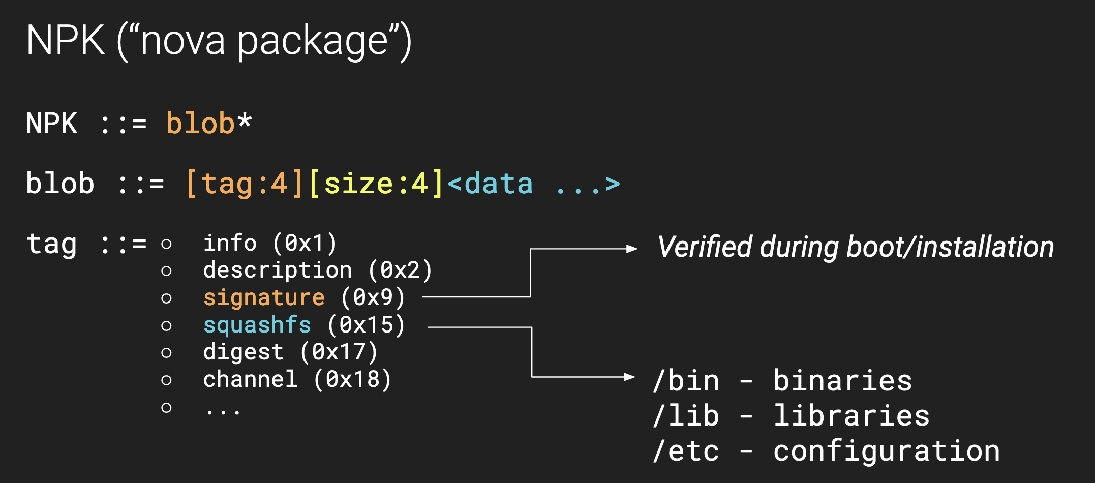 RouterOS software is distributed in .npk files (which we think stands for “nova package”). In recent versions of RouterOS, each NPK file contains a squashfs with the package data along with a cryptographic signature that RouterOS verifies during installation and every reboot.