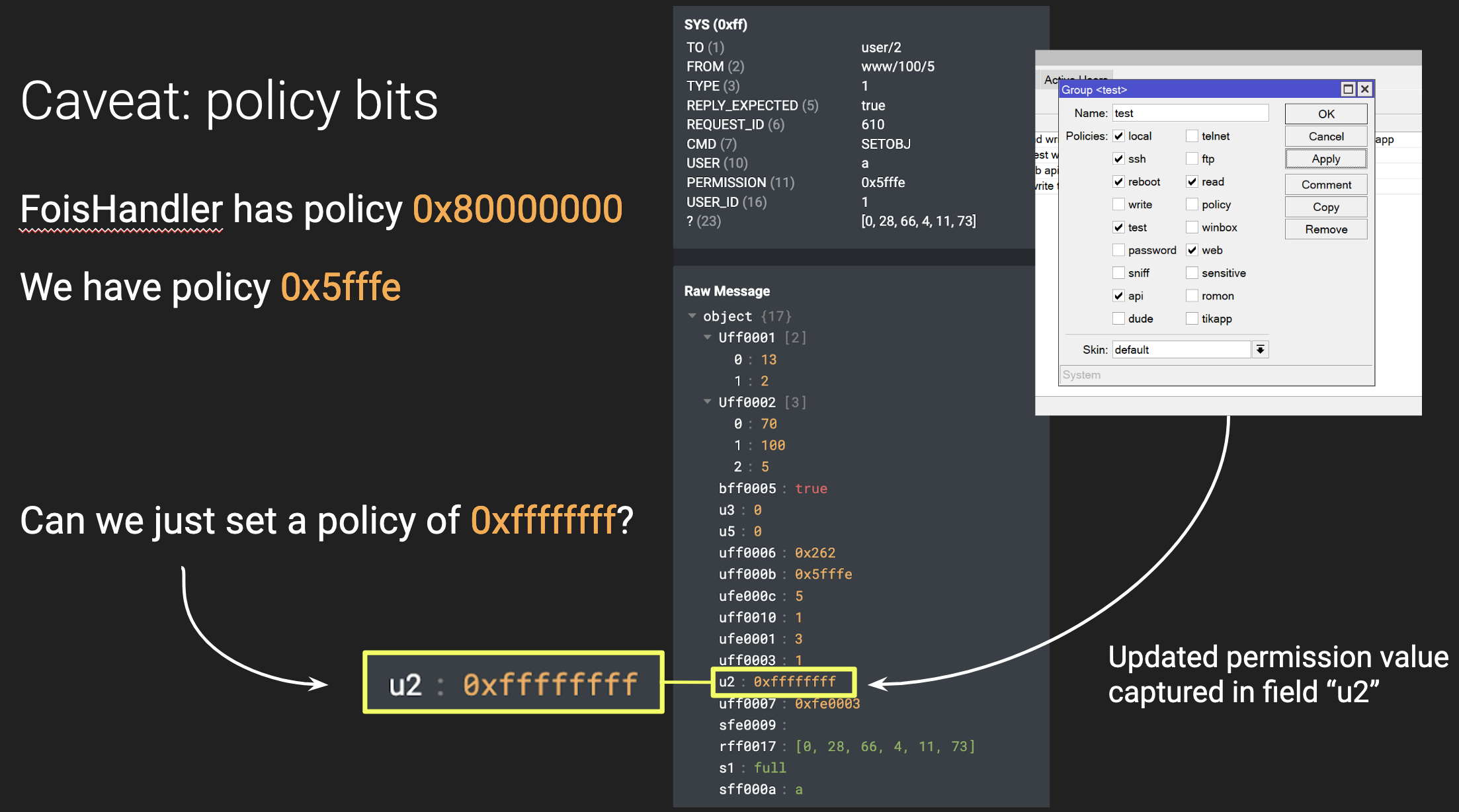 It turns out that RouterOS handlers are also gated based on a policy bitmask. In this case, our vulnerable handler www/2 (handler #2, FoisHandler) has a required policy of 0x80000000 which is unattainable via the GUI configuration panel. As an admin, our default policy bitmask is 0x5FFFE and the maximum we can set is 0x7FFFE.