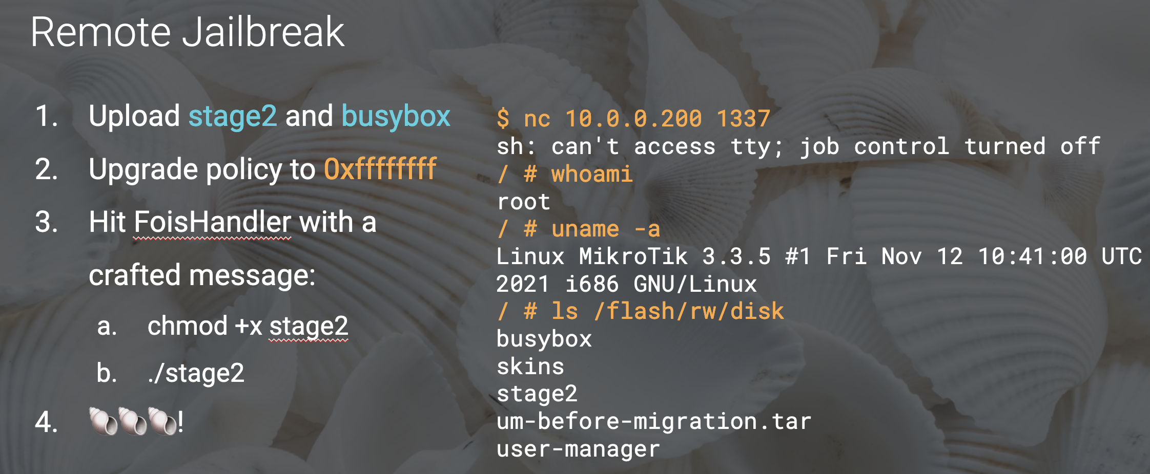 And just like that, we remotely jailbreak RouterOS for the first time in three years! It should be noted that this exploit is only viable on RouterOS v6, as FoisHandler was removed in the v7 overhaul.