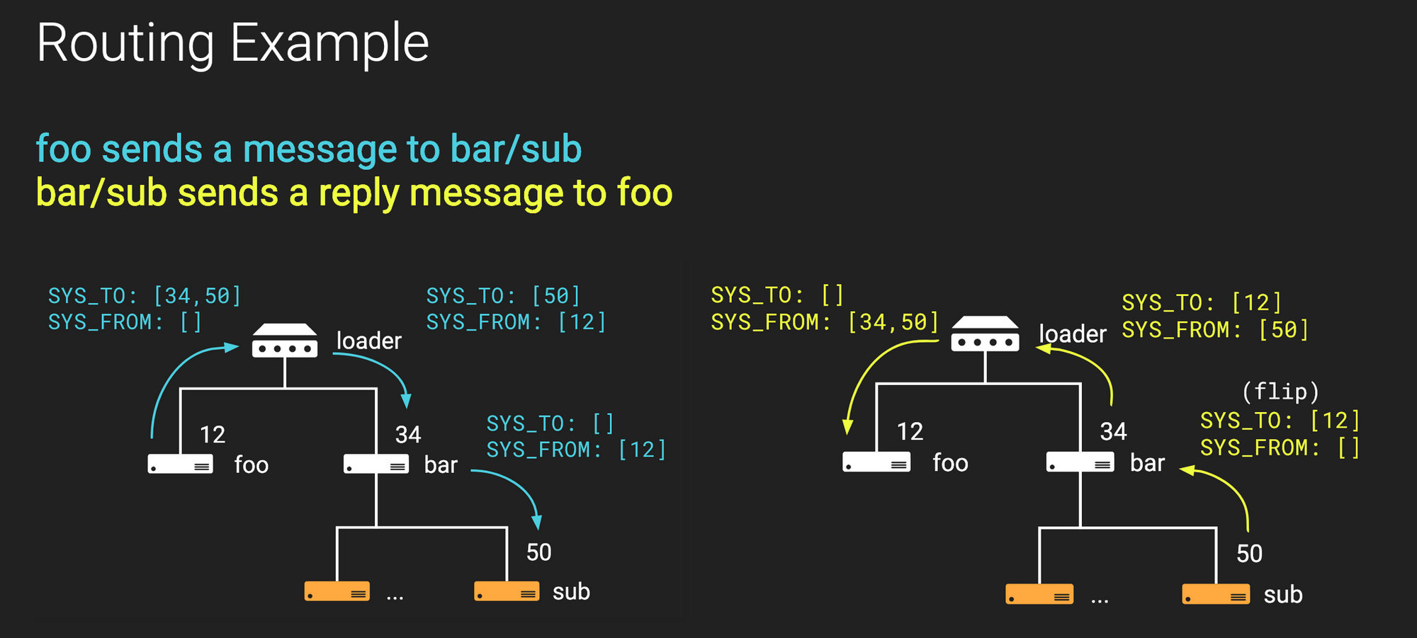 bar/subgenerates a response, it flips theSYS_TOandSYS_FROMlists in the original message. Now,SYS_TO=[12](foo) andSYS_FROM=[] bar/subpushes the message up to its parentLooperbar’sLooperreceives the message and identifies which handler sent it. In this case it isbar/sub, so it prepends50toSYS_FROMand forwards the message toLoaderover a pre-established socketloaderreceives the message, identifies the origin isbar(based on the incoming socket), and identifies the destination isfoo(based on the first entry inSYS_TO)loaderprepends34toSYS_FROMand strips the first entry fromSYS_TOand then forwards the message tofooover a socketfooreceives the message and, seeing asSYS_TOis empty, handles itfoo’sLooperidentifies this is a response to a previous request, prepares the return value, and returns execution tolooper.exchMessage()