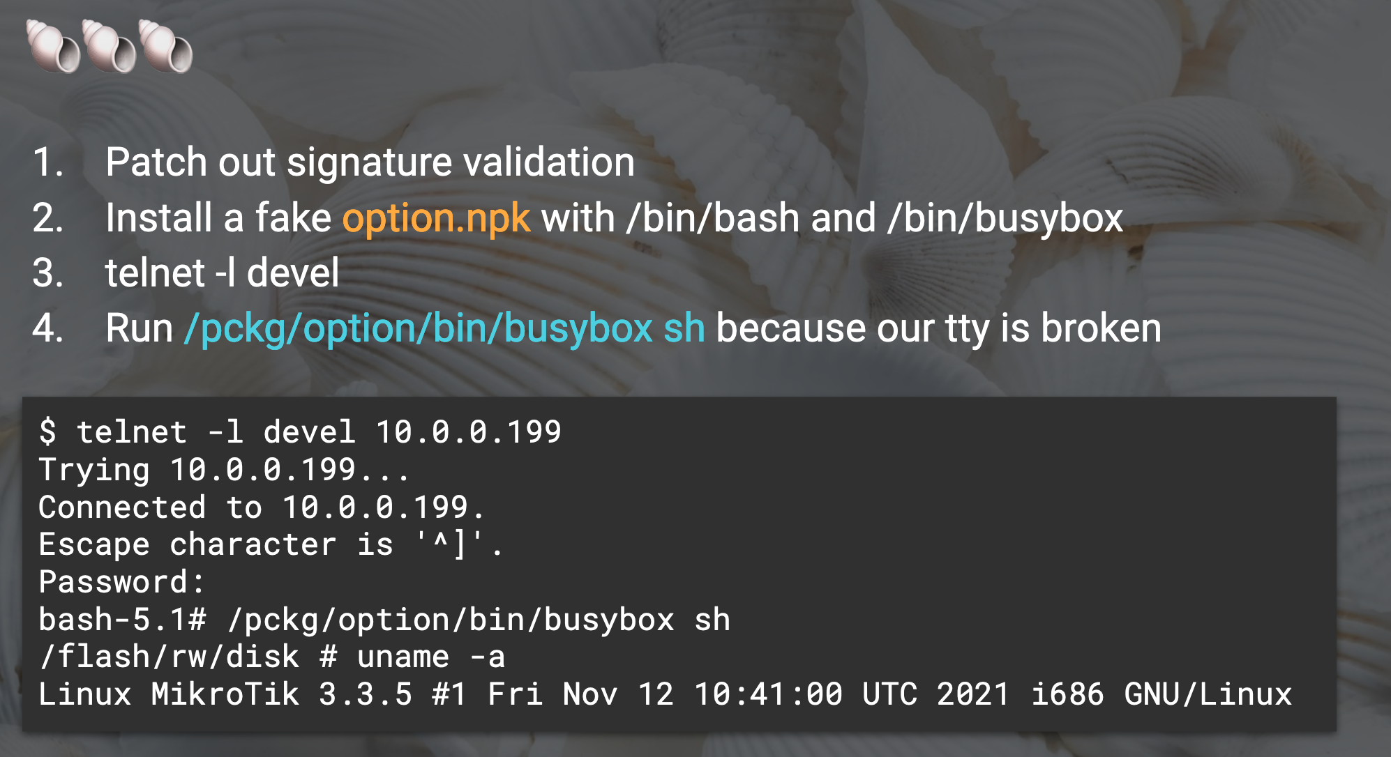 - We now understand the construction of MikroTik firmware packages, and how to bypass cryptographic signing to get a developer shell on the RouterOS virtual machine