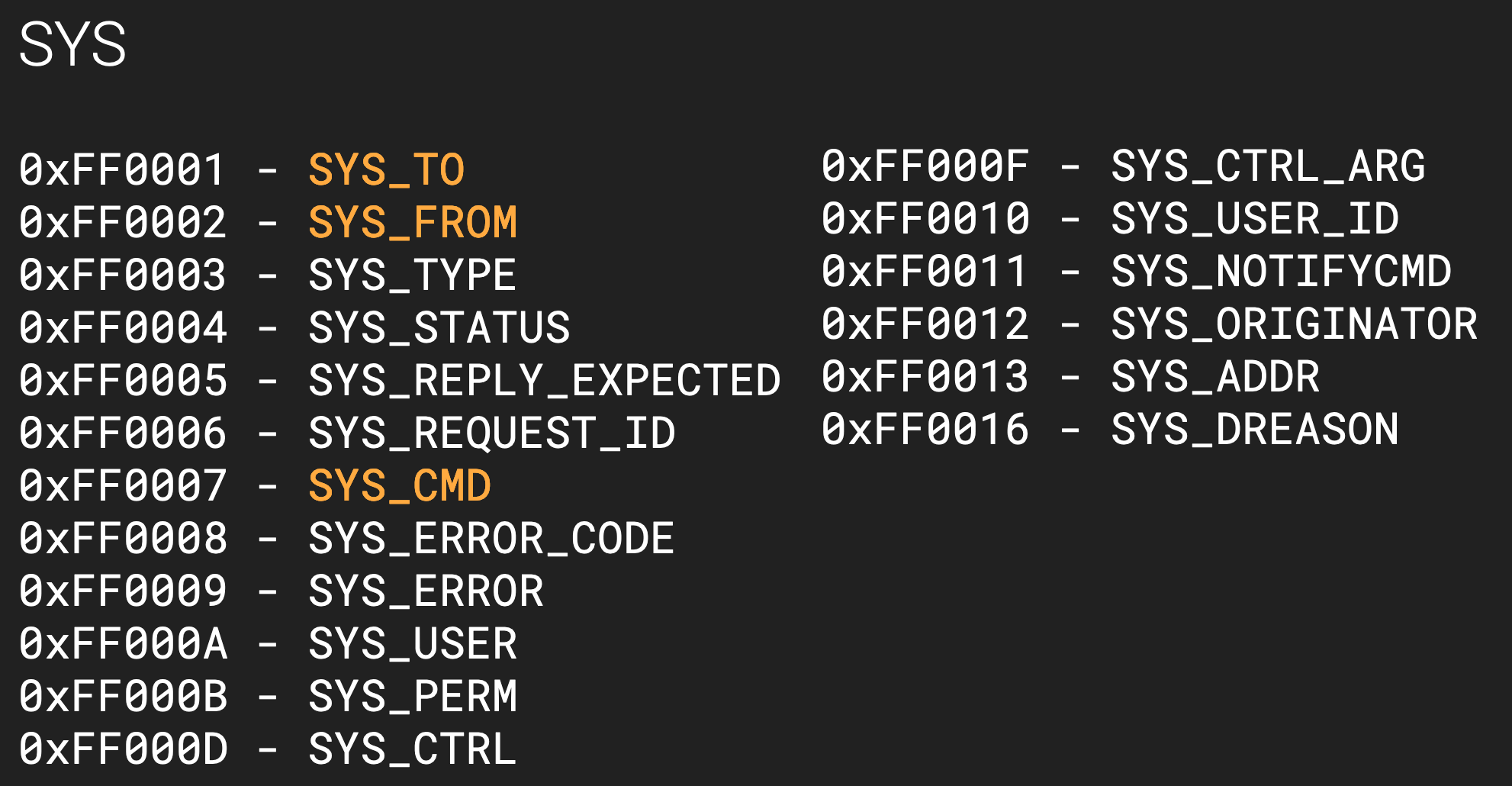 Each nova message key is a 24-bit integer and certain keys have a special meaning inside RouterOS. For example, keys of the form 0xFFxxxx correspond to the SYS namespace and are used during message routing: