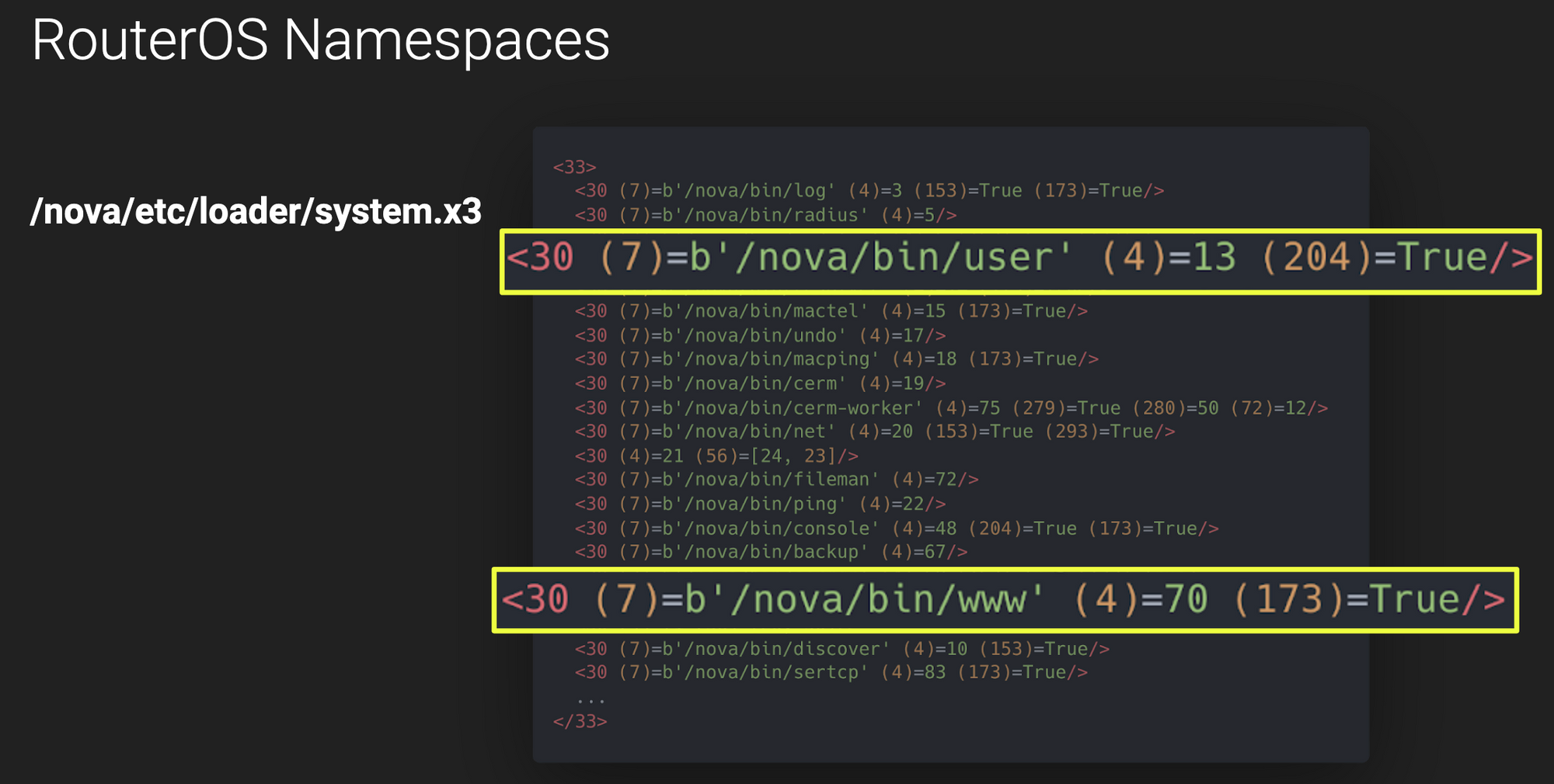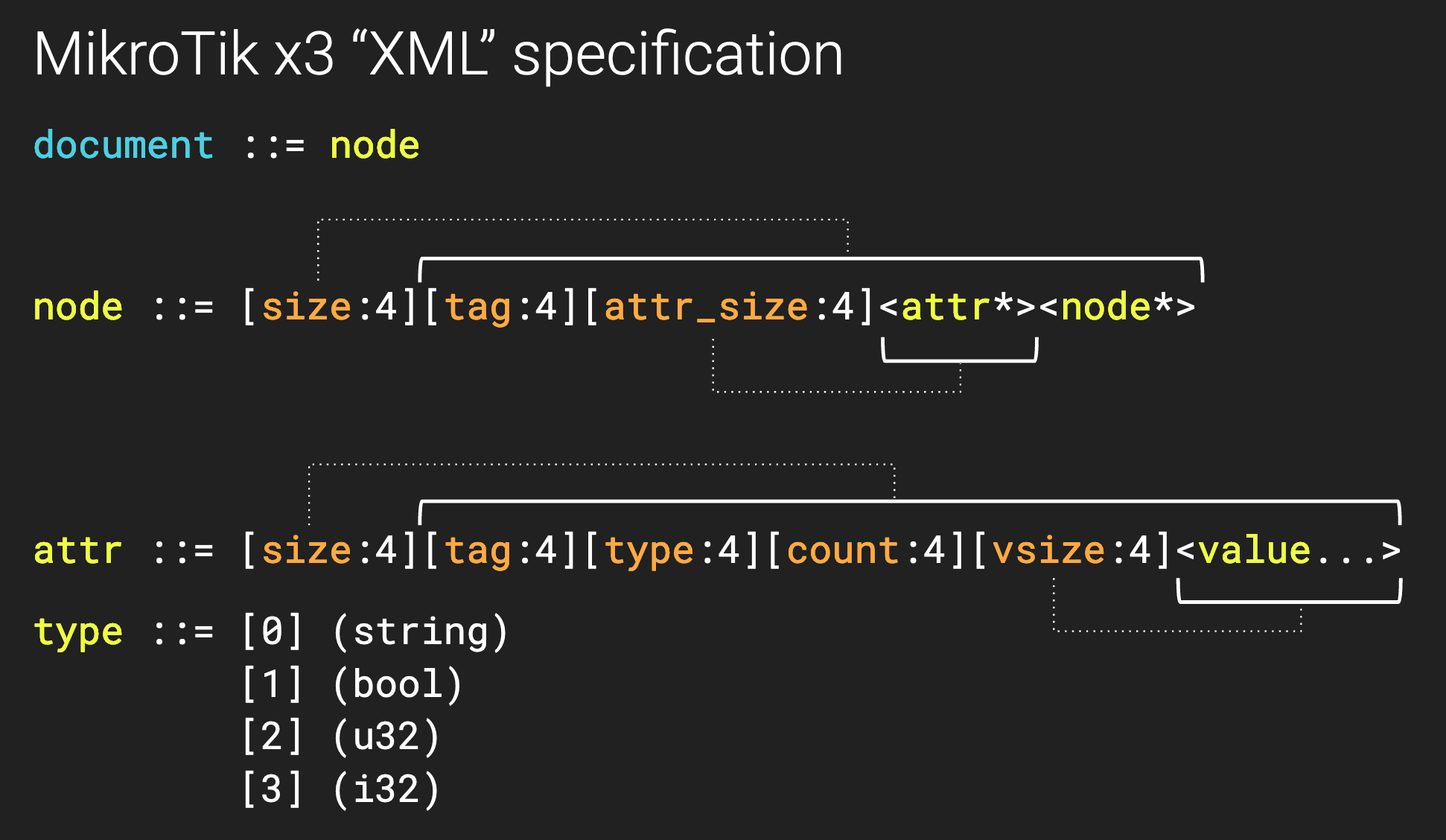 So how do we actually know which process [13, 4] corresponds to? First, remember that /nova/bin/loader is responsible for spawning all the processes. When we look inside loader, we see it reads from a configuration file at /nova/etc/loader/system.x3 using functions in the libuxml++.so library. Unfortunately, this .x3 file is not plain XML but appears to be some serialized format. With a bit of reverse engineering and some coffee, we recover MikroTik’s “pseudo-XML” format specification: