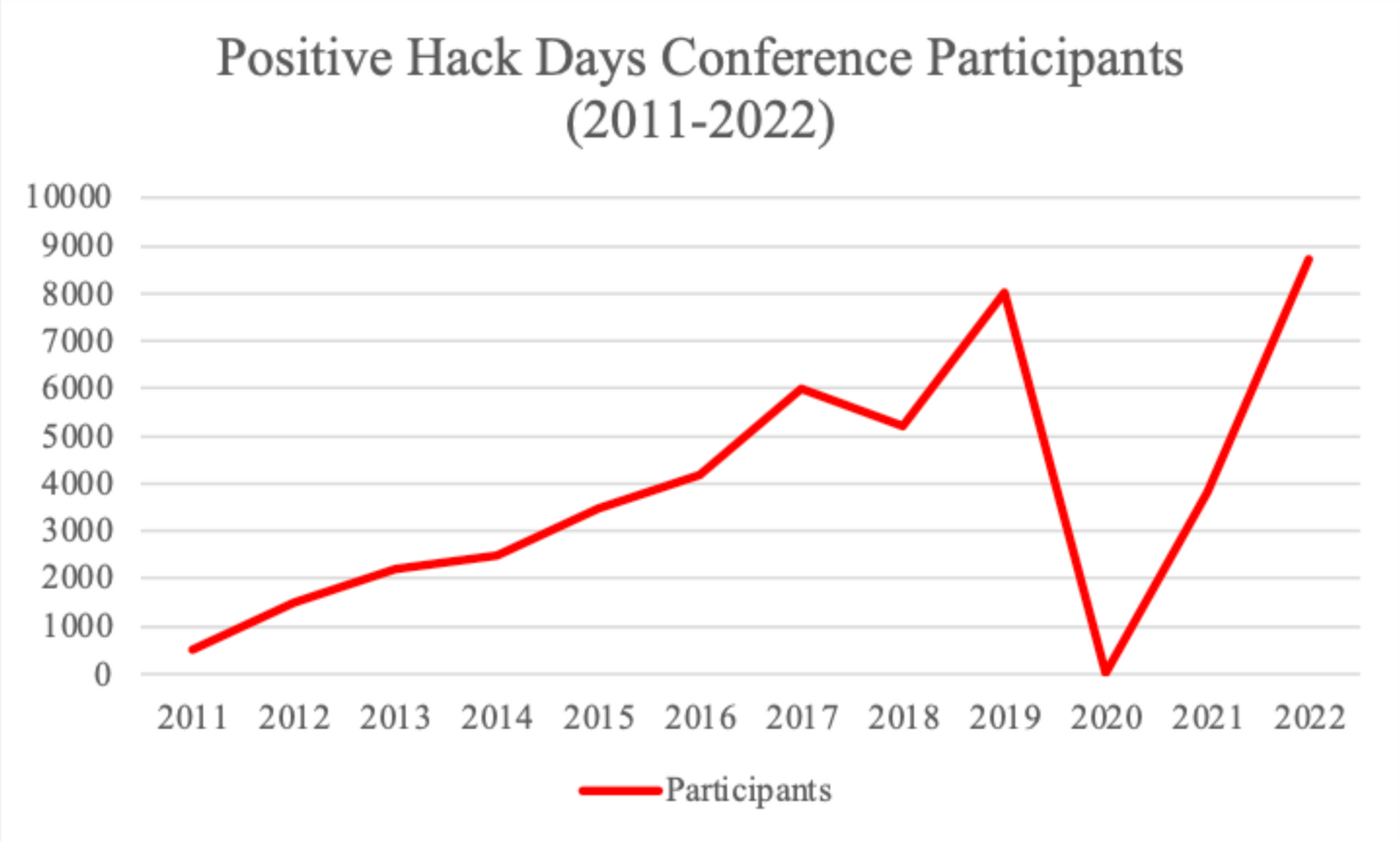 Treasury also stated that Positive Technologies “hosts large-scale conventions that are used as recruiting events for the FSB and GRU.” Its signature security conference-meets-capture the flag competition, Positive Hack Days, appears to be one such venue. The conference began in 2011 with around 500 participants. Since then, it has grown into a large event for the Russian hacker community: the 2022 Positive Hack Days featured dozens of speakers, had dozens of partners across the Russian cyber ecosystem, and saw nearly 9,000 people in attendance.