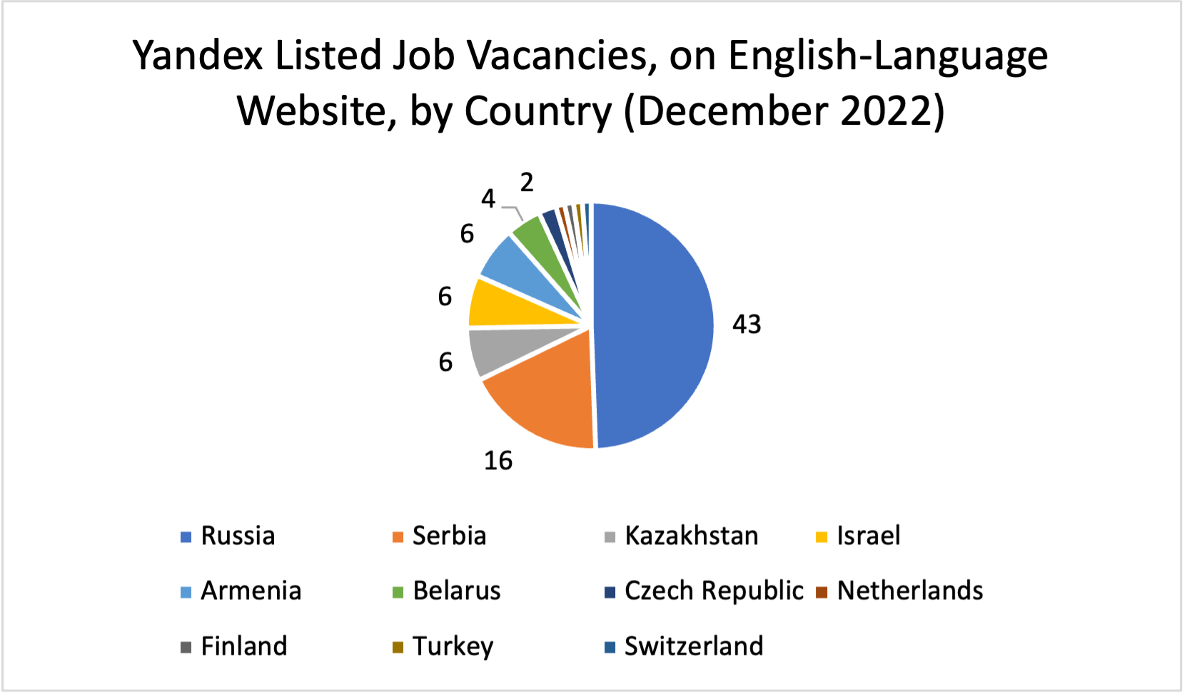 For job vacancies listed on the English-language Yandex website, approximately 50% were listed in Russia, followed by about 18% in Serbia and 7% each in Kazakhstan, Israel, and Armenia.