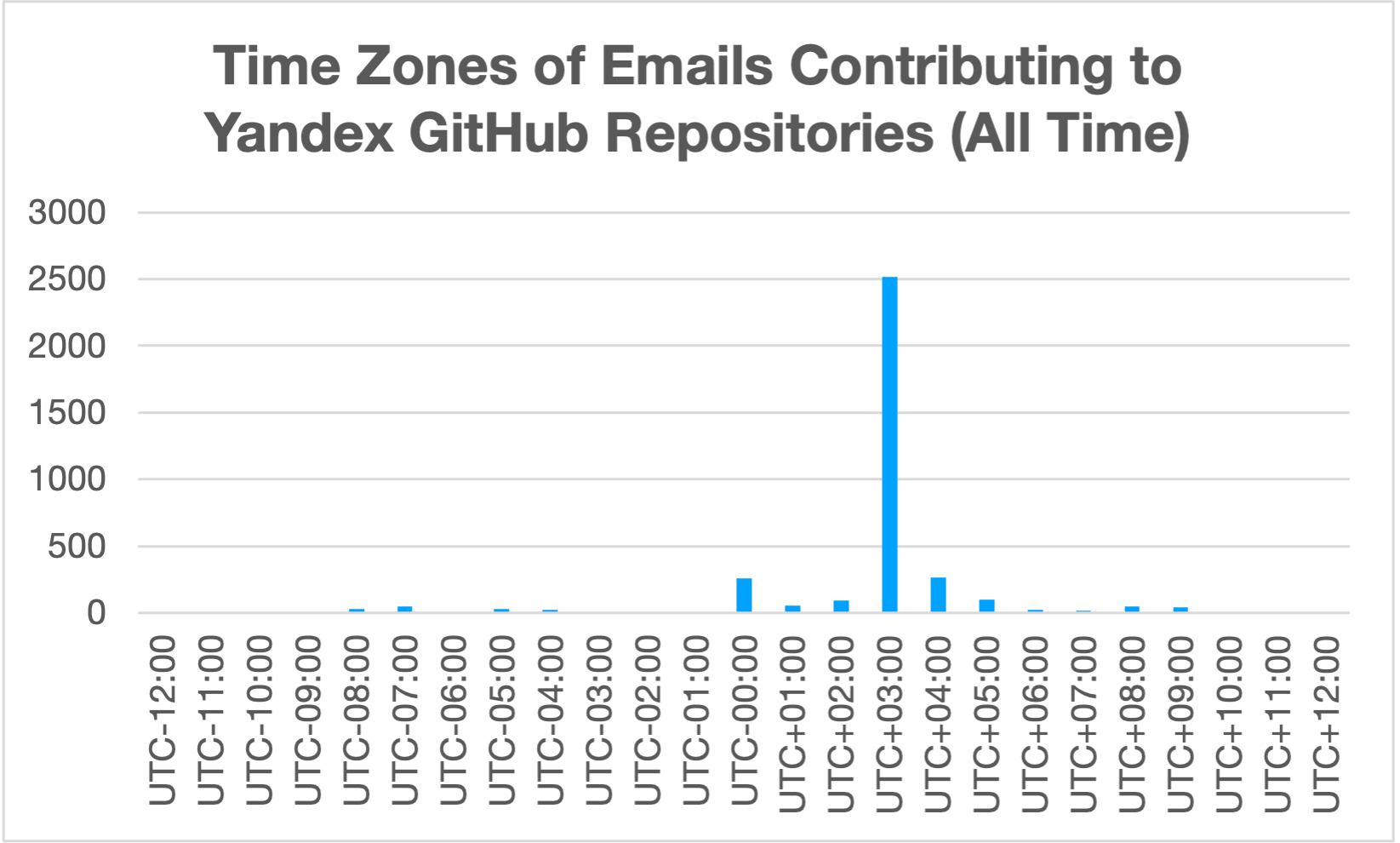 The majority of the emails contributing to Yandex’s GitHub repositories (over 2,500 of them) appeared to be doing so from the UTC+03:00 time zone, which encompasses East Africa (e.g., Comoros, Djibouti, Ethiopia, Kenya, Somalia), part of Antarctica, parts of Asia (e.g., Bahrain, Iraq, Jordan, Qatar, Saudi Arabia), part of Eastern Europe (e.g., Belarus, Turkey, Ukraine, the Abkhazia and South Ossetia regions), and part of Russia (including the Central Federal, Northwestern Federal, and Volga Federal districts). After that, there were 263 emails that appeared to be contributing from UTC+04:00 and 259 emails that appeared to be contributing from UTC-00:00. The former time zone, UTC+04:00, encompasses part of Russia (e.g., part of the Southern Federal District and Volga Federal District), the Caucasus region (e.g., Armenia, Azerbaijan, Georgia), part of the Middle East (Oman and the UAE), and part of Africa (e.g., Mauritius, Seychelles). The latter time zone, UTC-00:00, encompasses part of Western Europe (e.g., Portugal, UK, Faroe Islands) and the Atlantic Islands (e.g., Canary Islands).