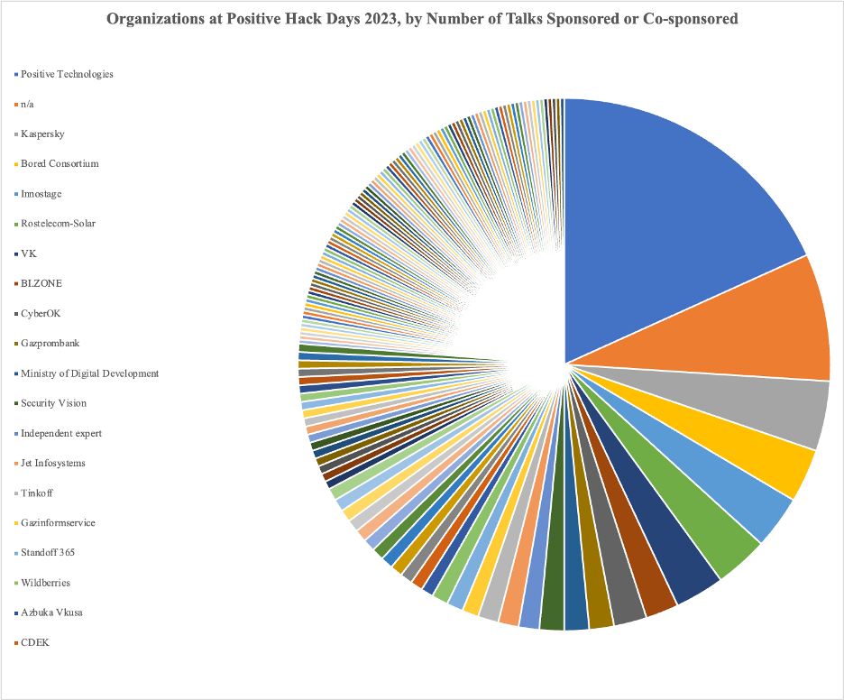 Broken down by the number of talks sponsored or co-sponsored—when a talk or panel had at least one member of the organization participating—the most represented organization was Positive Technologies. This was followed by entities marked “n/a” for their affiliation, often including independent security researchers; cybersecurity company Kaspersky; the Bored Consortium cryptocurrency community at ITMO University, a Russian national research university; cybersecurity company Innostage; cybersecurity company Rostelecom-Solar, which was purchased by state-owned telecom Rostelecom in 2018 (when it was “Solar Security”); and tech conglomerate VK (formerly VKontakte). VK is the parent company for the social network VKontakte, dubbed “Russia’s Facebook” because of its virtually identical design, as well as the Mail.ru email service, the VK Pay digital payments system, and many other tech products and services.