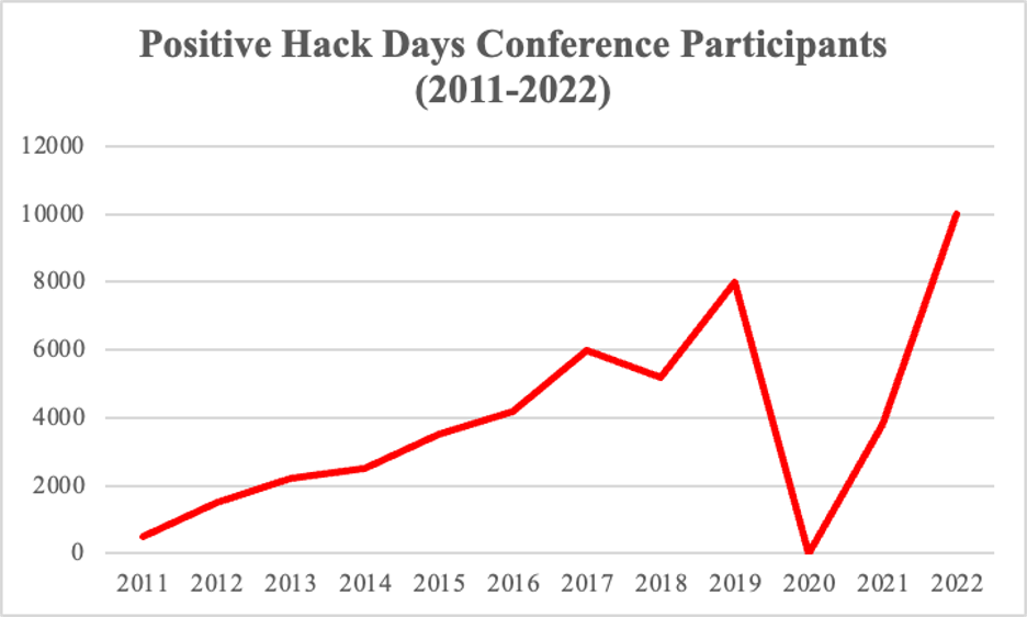 Positive Hack Days has rapidly grown since its inception in 2011. While attendance figures are not yet available for 2023, there were a record 10,000 attendees in 2022. Growth from 2011 to 2022 has otherwise been relatively steady, except for 2020, when the conference was canceled due to COVID-19, and 2021, when attendance numbers were still recovering.