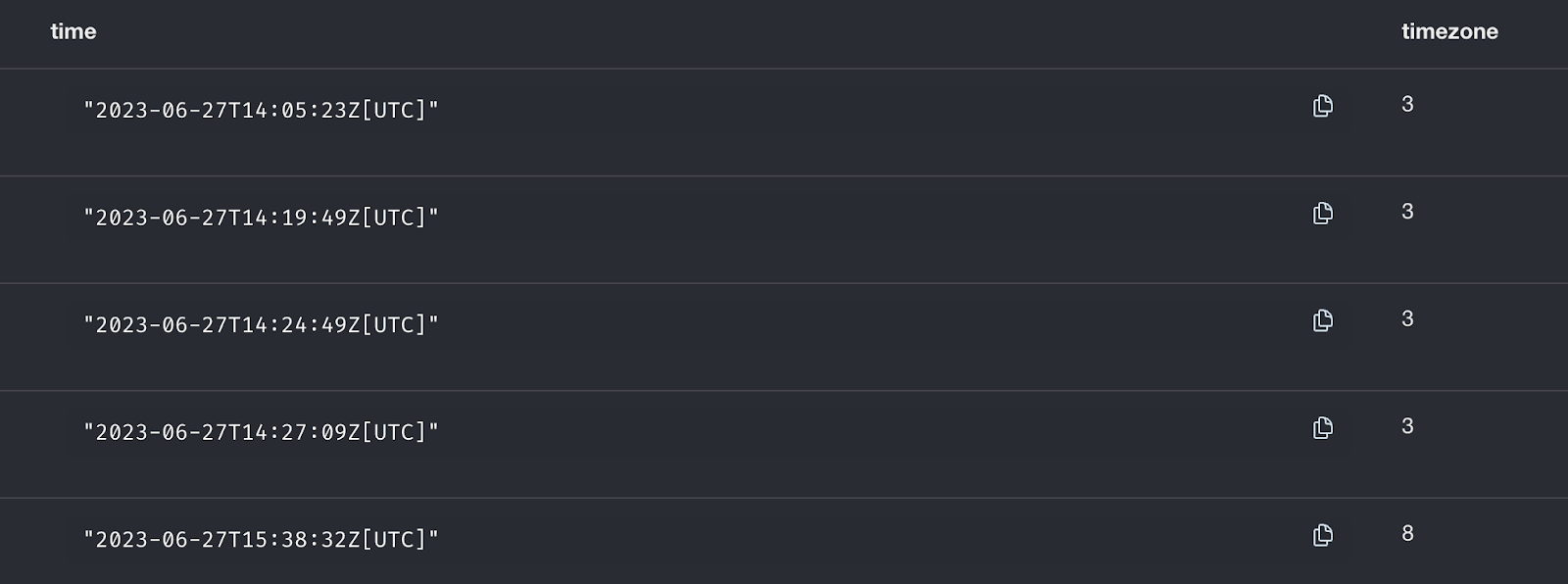 The fourth of these commits was marked as coming from UTC+03:00, which would be somewhere on the eastern edge of Europe. The fifth of these commits, made one hour and 11 minutes later, was marked as coming from UTC+08:00, which would be somewhere on the most western point in China. It is impossible to physically travel between the eastern edge of Europe and the westernmost point in China in one hour and 11 minutes, indicating inauthentic behavior—that is, manual modifications of time zones to make the code contributor appear somewhere they are not. This works because git time zone metadata is system time-specific, not IP address-specific. For example, if you are physically based in Los Angeles (UTC-07:00) and using a VPN that assigns you an IP address in Japan (UTC+09:00), your system time would still show Los Angeles time (UTC-07:00)—and a standard git commit from your computer would therefore show the local time zone (UTC-07:00) rather than the time zone of the VPN-assigned IP address’ location (i.e., Japan, or UTC+09:00).